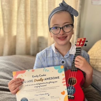After an initial period of “watch and wait,” Emily began 52 weeks of chemotherapy in 2020. During this time, she accessed music therapy through the Robert Connor Dawes Foundation, an experience that brought joy, creativity and connection in the midst of treatment.