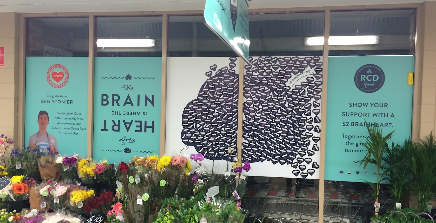 As part of the supermarket's national competition to reward generous community driven employees, Ben has been awarded title of Local Community Hero. Continuing Coles' support of the RCD Fund's annual Connor's Run event, the local store has been taken over this week by a giant brain display. With a simple message to do as Ben does and support brain matters, shoppers are able to symbolically 'fill in the gaps in brain tumour research' by buying a little brainheart cell to put up on the window.