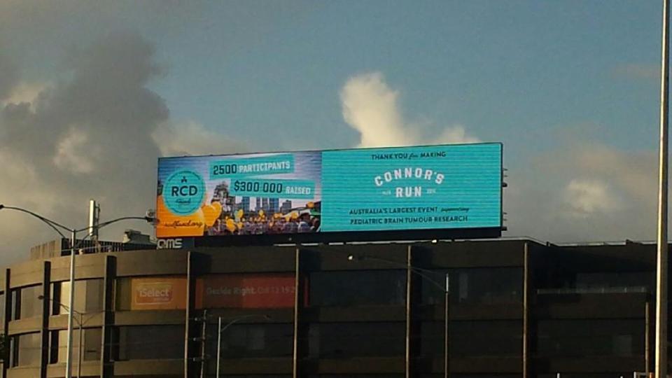 High above the corner of South Rd and Nepean Hwy in Melbourne's south is a billboard with a big message. Through the generous support of QMS Australia, we are able to thank everyone who made Connor's Run 2014 a success. It was like a big digital hug from a high.